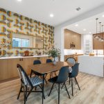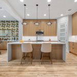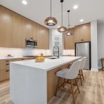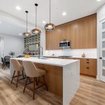 Then there’s the kitchen & dining area… The custom kitchen strikes that rare balance between modern and timeless – wood cabinetry, quartz countertops, stainless steel appliances, and a waterfall-edge island with breakfast bar that works just as well for weeknight dinners as it does for entertaining.