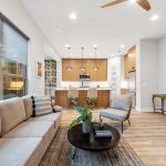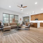 The main living area is where this home really shines. Abundant natural light pours in through a full wall of windows, highlighting vinyl plank wood flooring and soft, neutral tones that keep the space feeling open and connected.