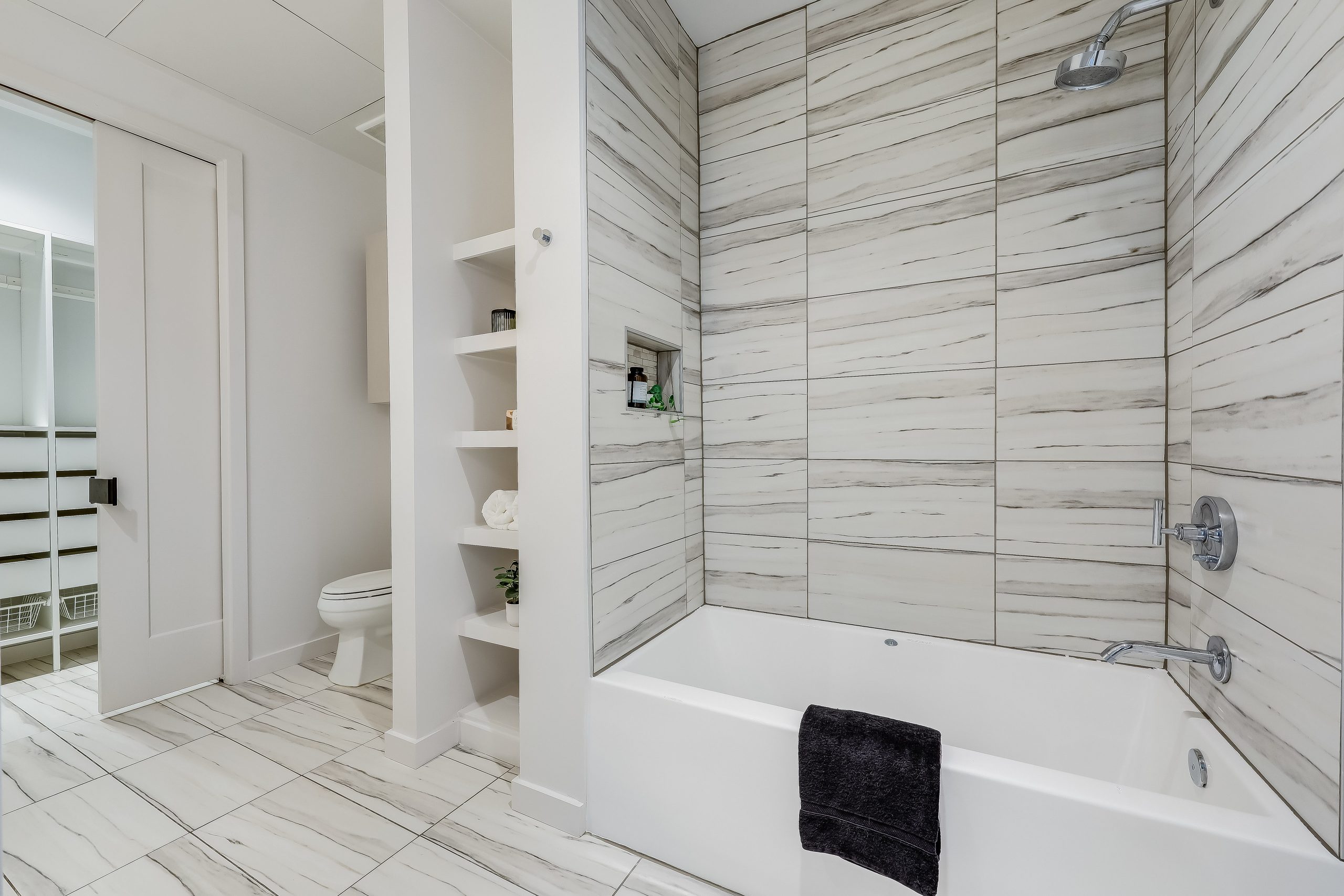 The bedroom is calm, private, and opens directly to a spacious terrace overlooking the courtyard — your personal oasis in the heart of East Austin. The bathroom delivers boutique-hotel vibes with a dual vanity, soaking tub, and thoughtful built-in storage. There’s even a laundry closet, proving that practicality and beauty can absolutely coexist.