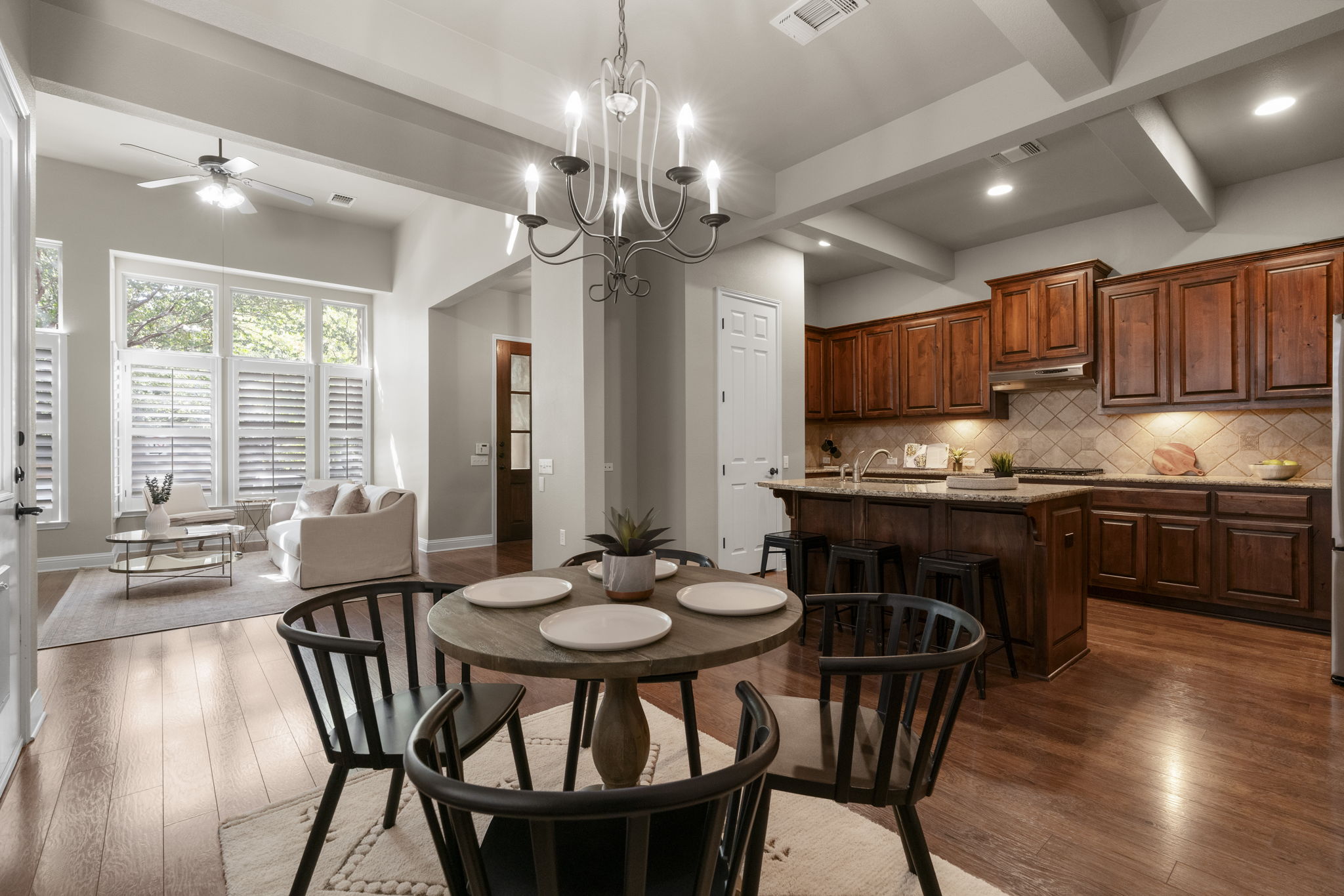 - Open-concept dining and kitchen with limestone feature wall, granite counters, and rich cabinetry — perfect for entertaining in the heart of Mueller.