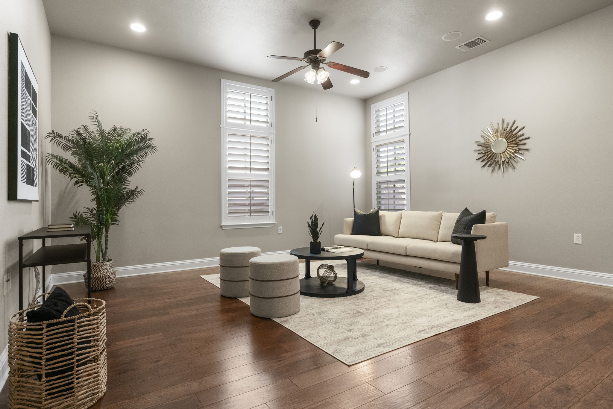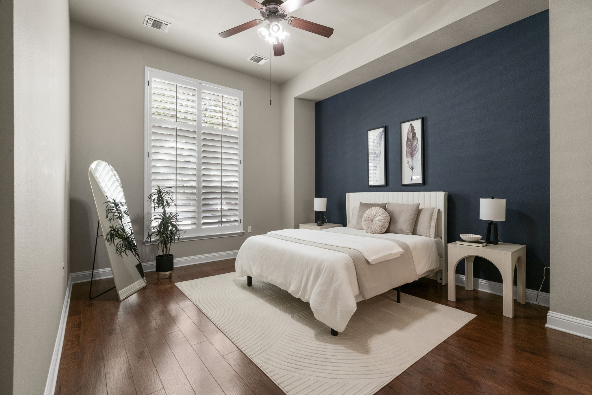 - Spacious primary suite with hardwood floors, deep navy accent wall, and plantation shutters for style and privacy.