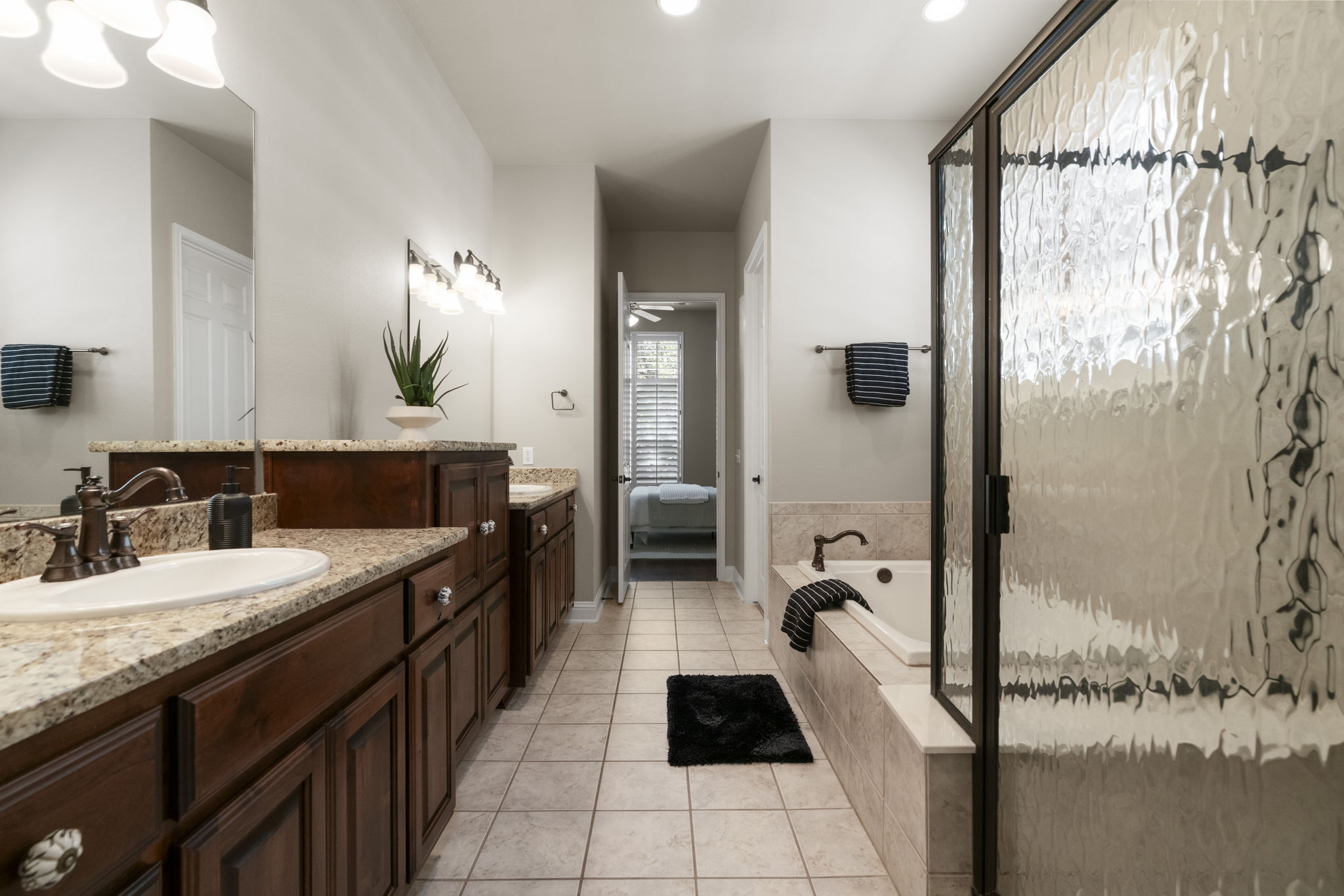 - Luxurious ensuite bath featuring dual vanities, granite counters, soaking tub, and walk-in shower with textured glass.
