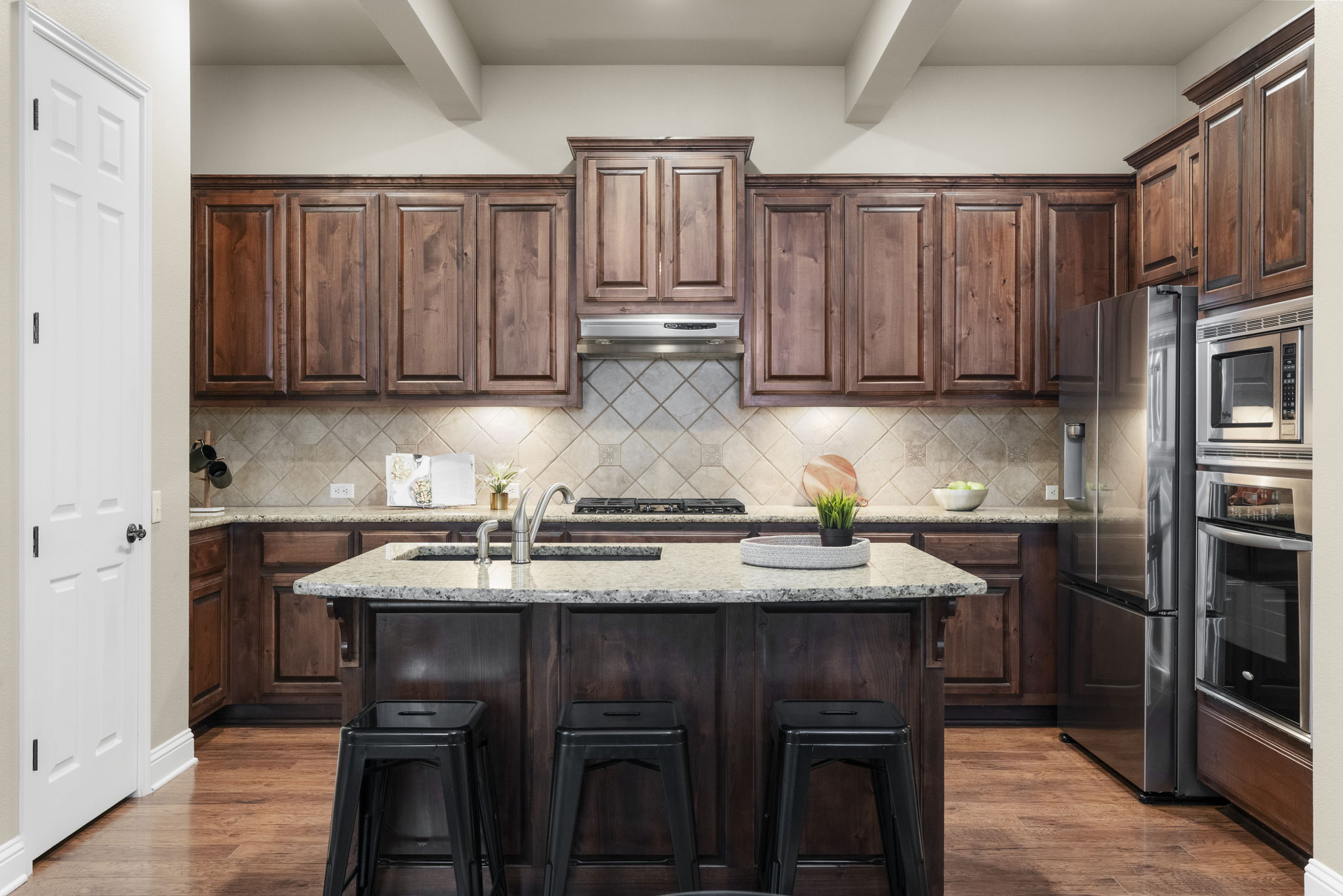 - Chef’s kitchen with stainless appliances, granite island seating, and custom wood cabinetry offering warmth and function.